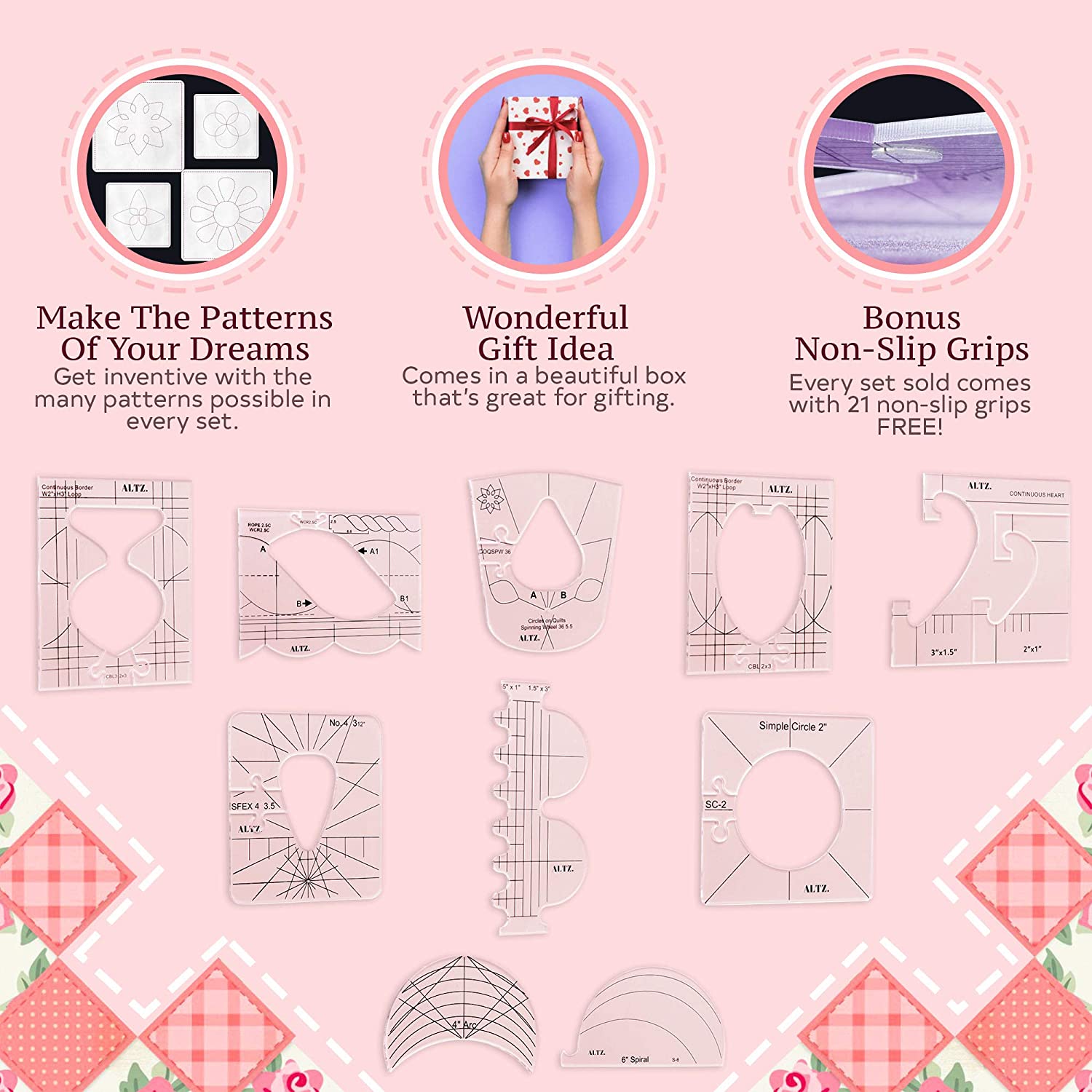- 10 FANTASTIC QUILTING TEMPLATES: … Each set contains 10 different acrylic quilt templates, so you can create the BEAUTIFUL FABRIC PATTERNS you’ve always desired!