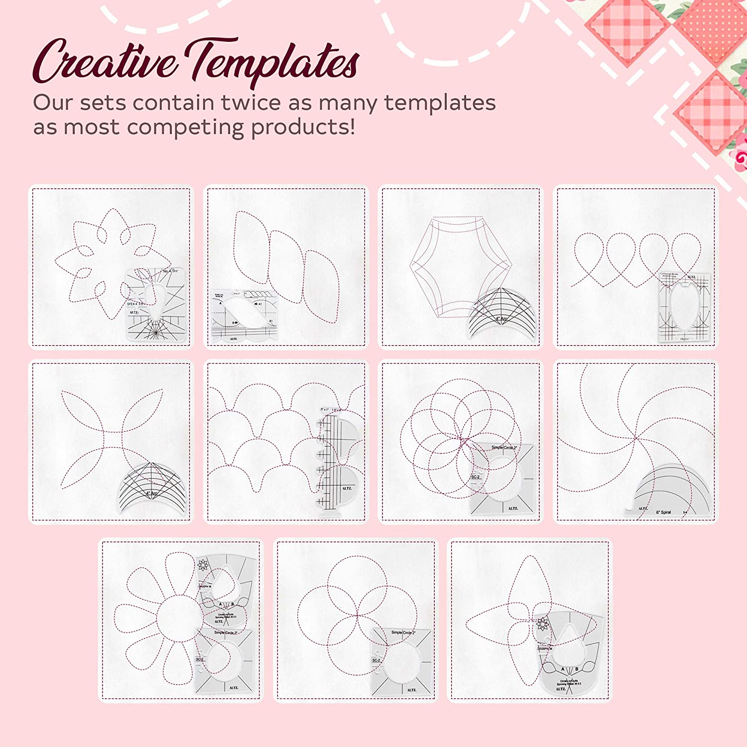 - TWICE AS MANY TEMPLATES: While most competing products only offer half a dozen quilt template options, ours give you TWICE AS MANY in every box.