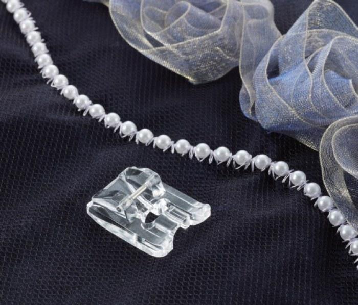 Beading is now made faster than before with CraftsCapitol™ Premium Beading/Piping Presser Foott! Simply feed a string of round beads through the centre as you stitch a zigzag stitch with your beads attached to your fabric!