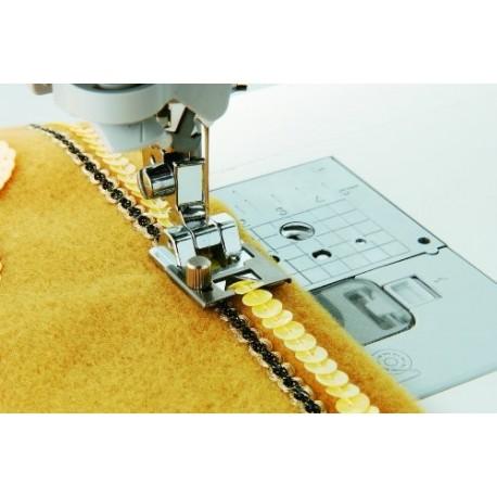 The braiding foot (also known as couching or cording foot) is a specialty foot that fits in place of the standard foot. It’s used to attach decorative trim such as braid, cord, piping, yarn, and ribbon to fabric.