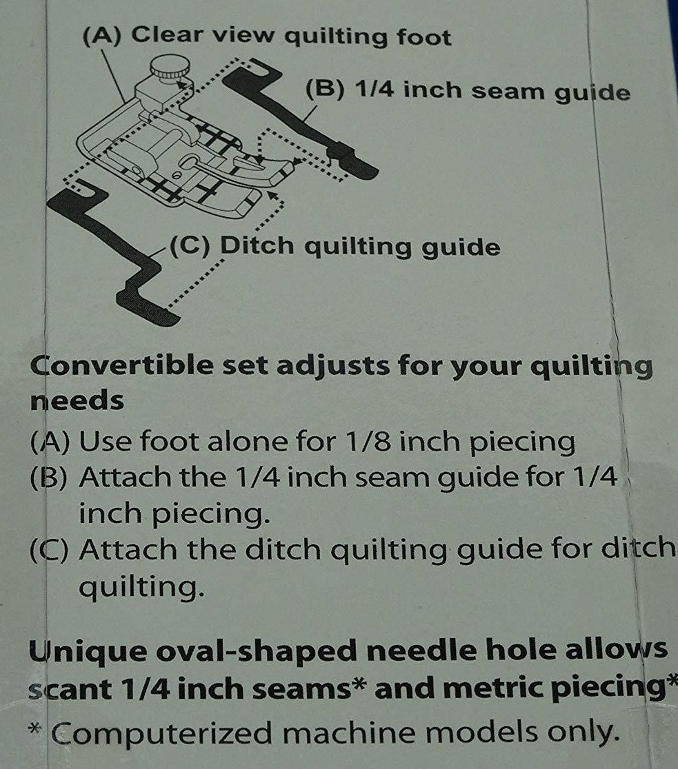 Suitable for: Clear Quarter Inch & Stitch in a Ditch Foot is an excellent sewing tool for a quilter, seamstress or sewing hobbyists who want to improve their sewing project by experimenting with different designs.