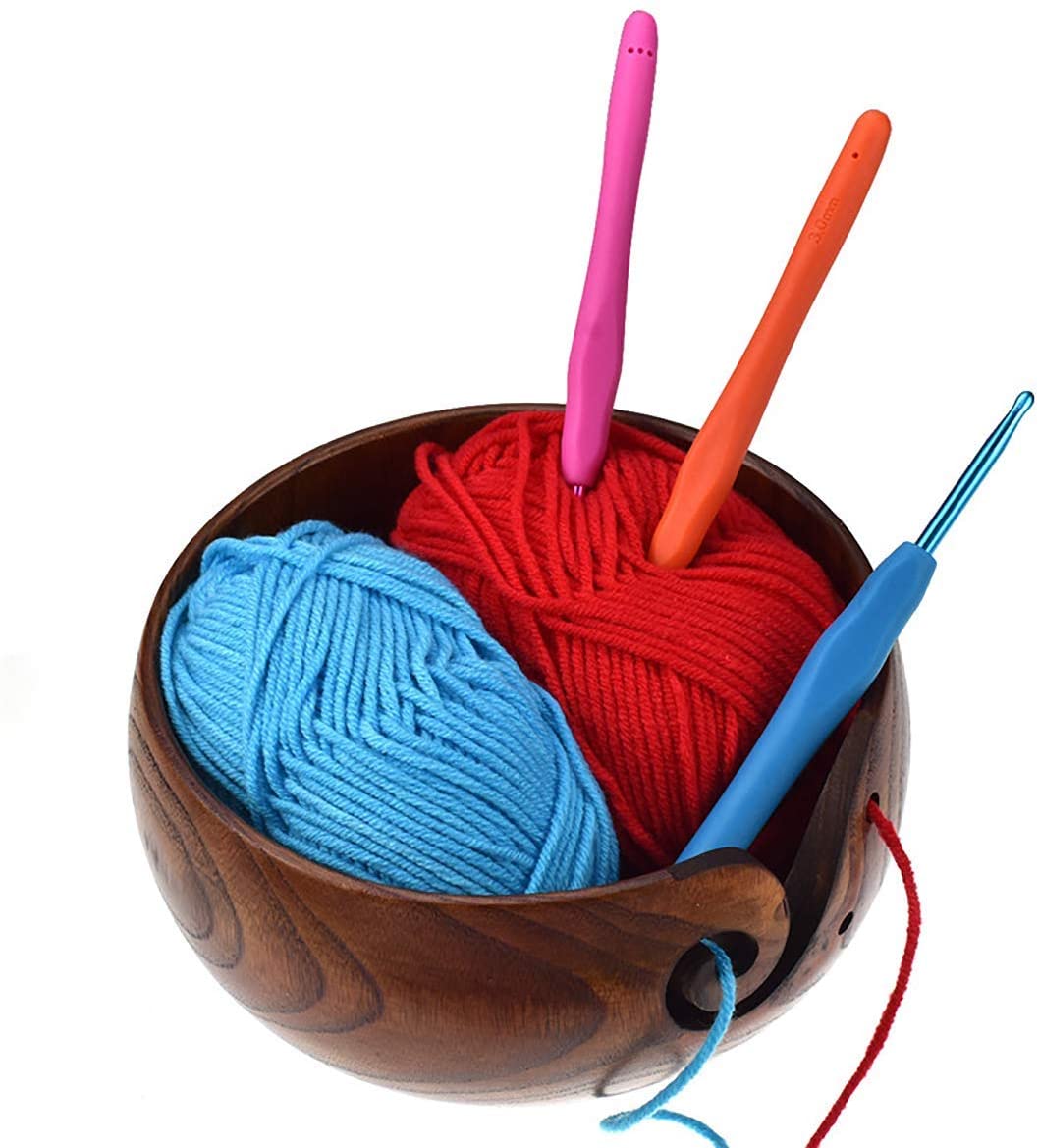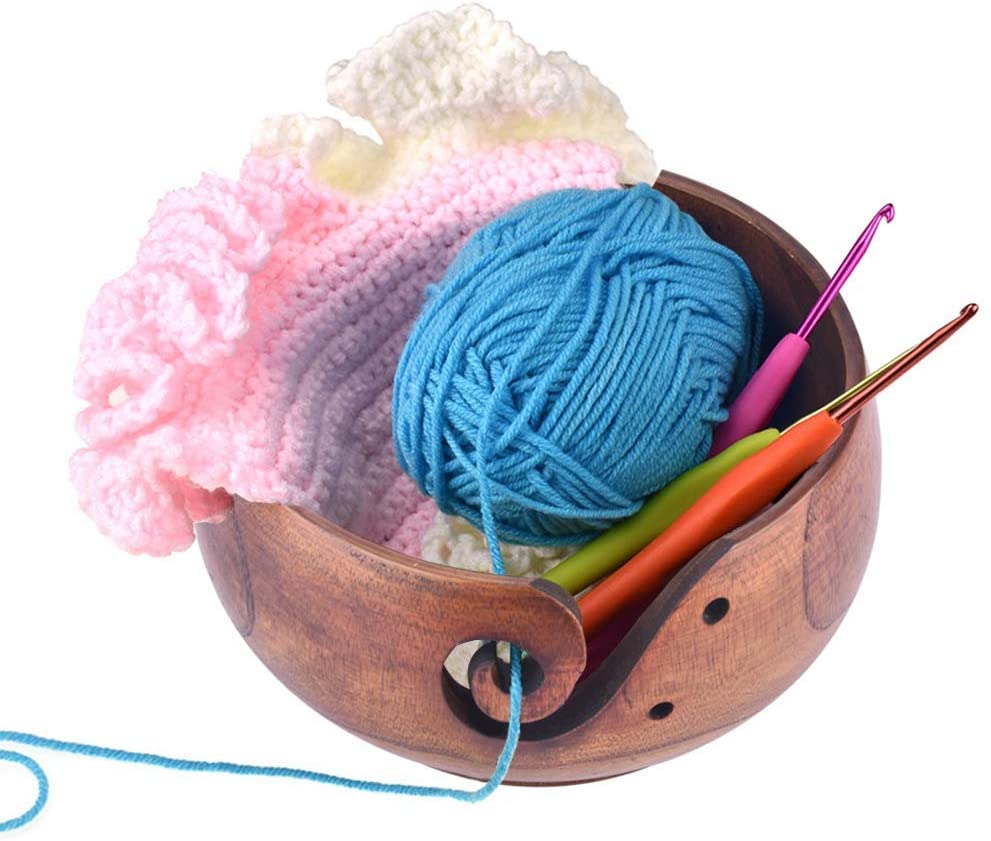 - PRACTICAL: Keeps your yarn clean and fixed, regulates necessary tension while you crochet or knit. The holes hold a pair of knitting needles. Also, this wonder-bowl protects yarn from naughty and playful pets. Our yarn holder stops your yarn from wandering off! No more creeping under the sofa, making friends with dust bunnies, or gathering small surprises to be forever added to your project.