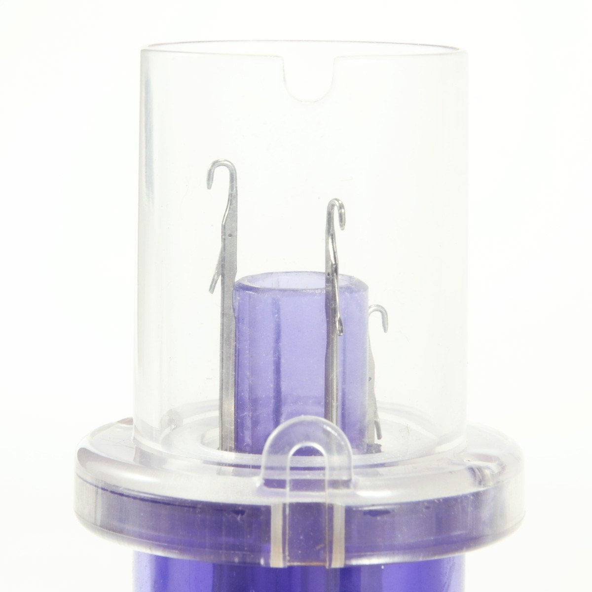 3. Continue turning the handle slowly. Push the yarn behind the second needle using the top of your tapestry needle. Continue turning the handle until the third needle catches the yarn.