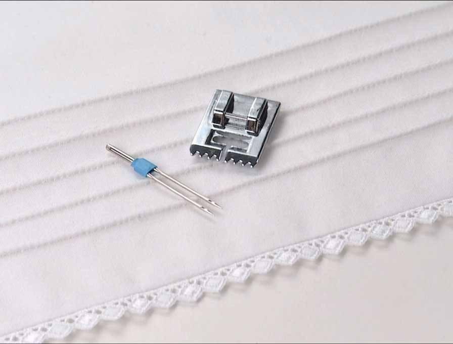 When using this presser foot, it is also necessary to use a twin needle. Without the twin needle, creating the right effect won’t be achieved. Remember to choose a twin needle that matches the size of your Pintuck foot.