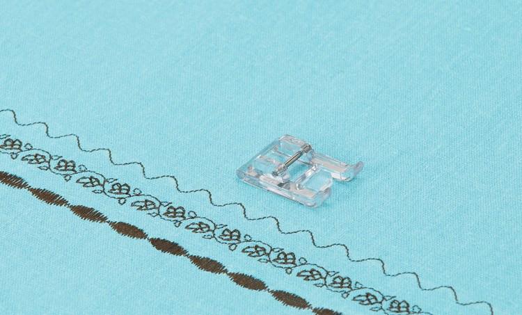 “This pressure foot slides over dense stitching and doesn’t catch like other pressure feet. It’s clear so you can see what you are doing.”